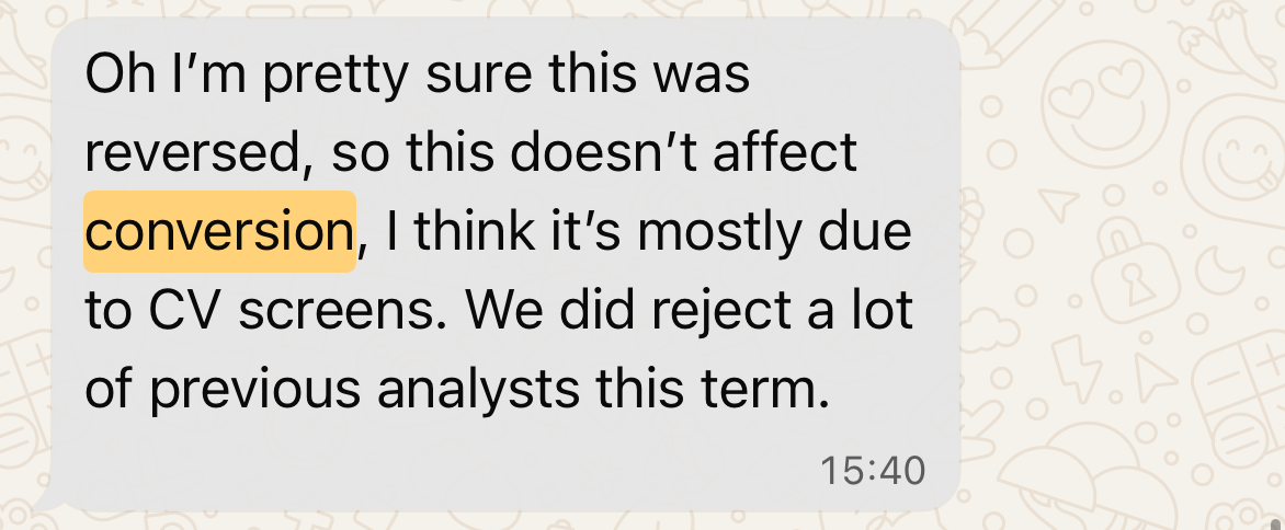 Even though it was promised that the email and the affairs wouldn’t affect my application, I was not invited back to do an M&A pitch next term. This could be because my CV was uncompetitive or because my performance was poor, but I had received and completed spring weeks in one of the top European banks for M&A.